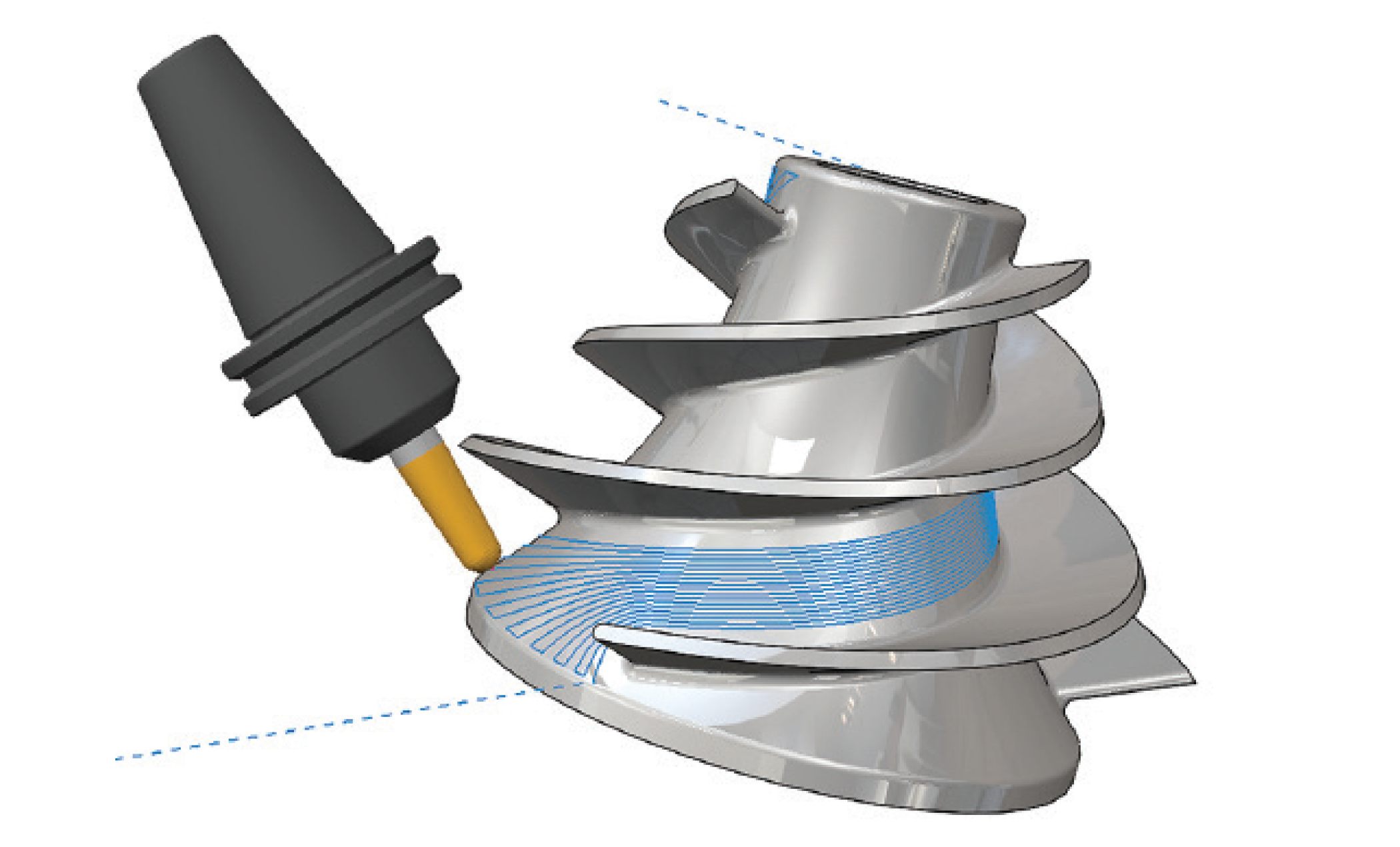 CAMWorksMultiaxis Machining software for programming multi-axis CNC machines allows a wide variety of shops and manufacturing facilities to take advantage of 4/5 Axis machines that provide greater productivity, equipment flexibility and quality. CAMWorks 4/5 Axis simultaneous machining programming software allows the user to create toolpaths across complex shapes that could not be machined on 3 Axis machines. This includes high-performance automotive port finishing, impellers, turbine blades, cutting tools, 5 Axis trimming, and undercut machining in mold and die making. CAMWorks 4 Axis simultaneous machining is designed for complex rotary applications such as camshafts, extrusion screws and blades..