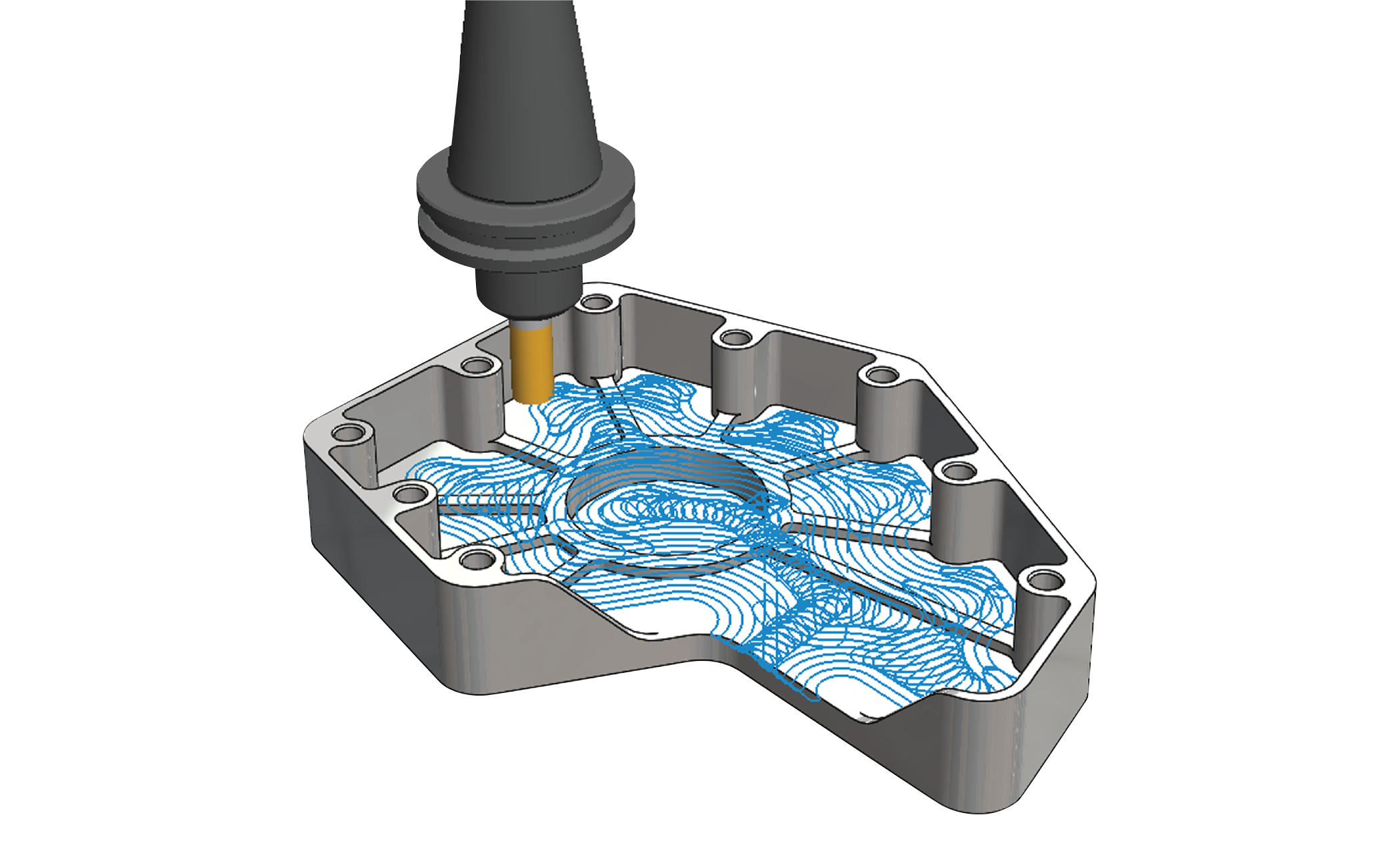 CAMWorksVoluMillTM is an optional milling toolpath engine for 2.5 axis and 3 axis roughing operations. It is ideal for prismatic parts and complex 3-D shapes as its algorithms result in more intelligent toolpaths to machine pockets, slots, and arbitrary shapes. It can be used with any material, including the hardest metals. The result is increased efficiency and utilization of machines, tools, labor and materials.